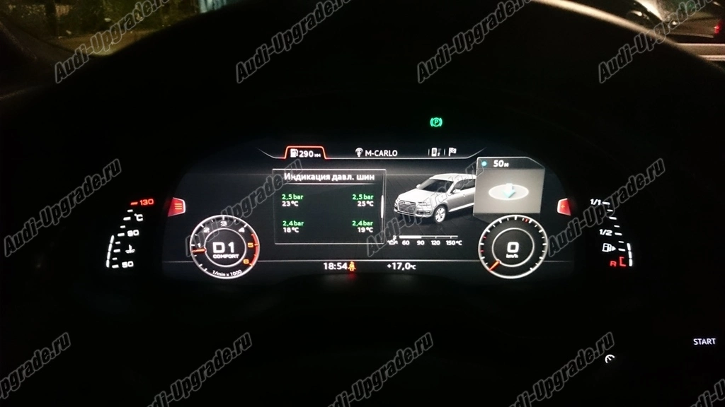 Полностью цифровая панель приборов AUDI Q7 4M с экраном размером 12,3" для отображения информации ,бортового компьютера, круиз контроля, различных вспомогательных систем, скорость, тахометр,  радио, мультимедия и телефония.Различны несколько видов дизайна графики.