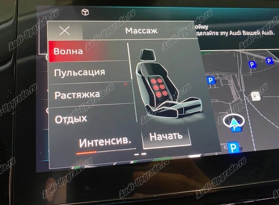 Пневматический массаж.10 камер, регулировка интенсивности, отображение режимов на MMI