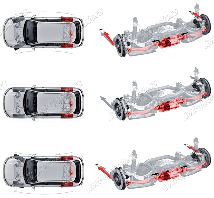 Улучшает динамику и повышает комфорт управления за счет изменения угла направления задних колес.