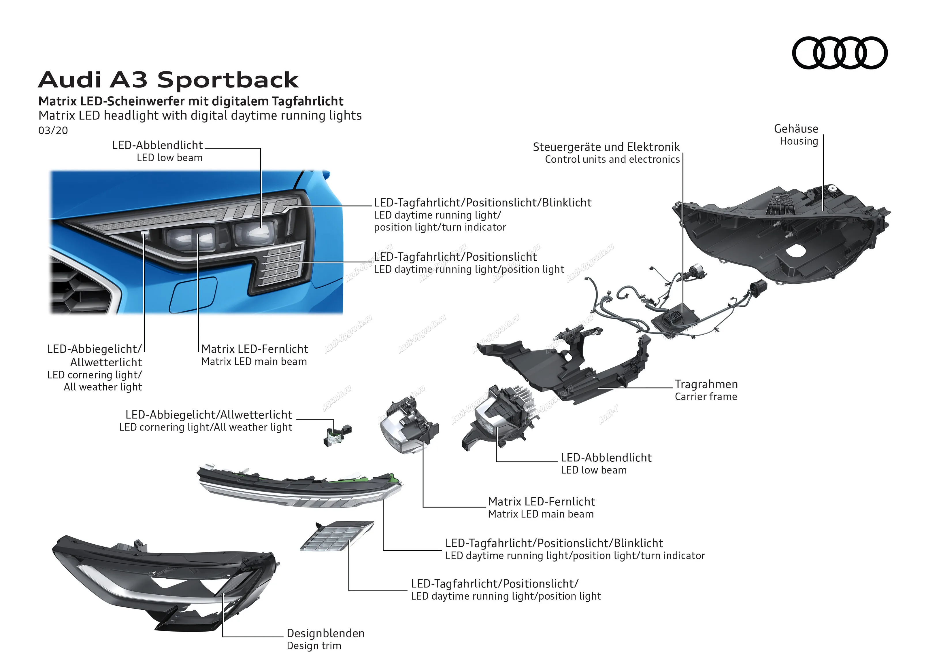 Технология Audi Matrix LED обеспечивает точное освещение с высоким разрешением. Эффект бликов на встречных или предшествующих транспортных средствах может быть значительно уменьшен. Если они распознаются системой камеры, система выборочно скрывает только область распознанного транспортного средства, в то время как дальний свет остается активным в оставшихся сегментах. Переключение между соответствующим распределением света и регулированием при прохождении встречного движения видны в фарах как динамические процессы. Значительно улучшенное освещение дороги повышает безопасность и комфорт при движении в темноте.