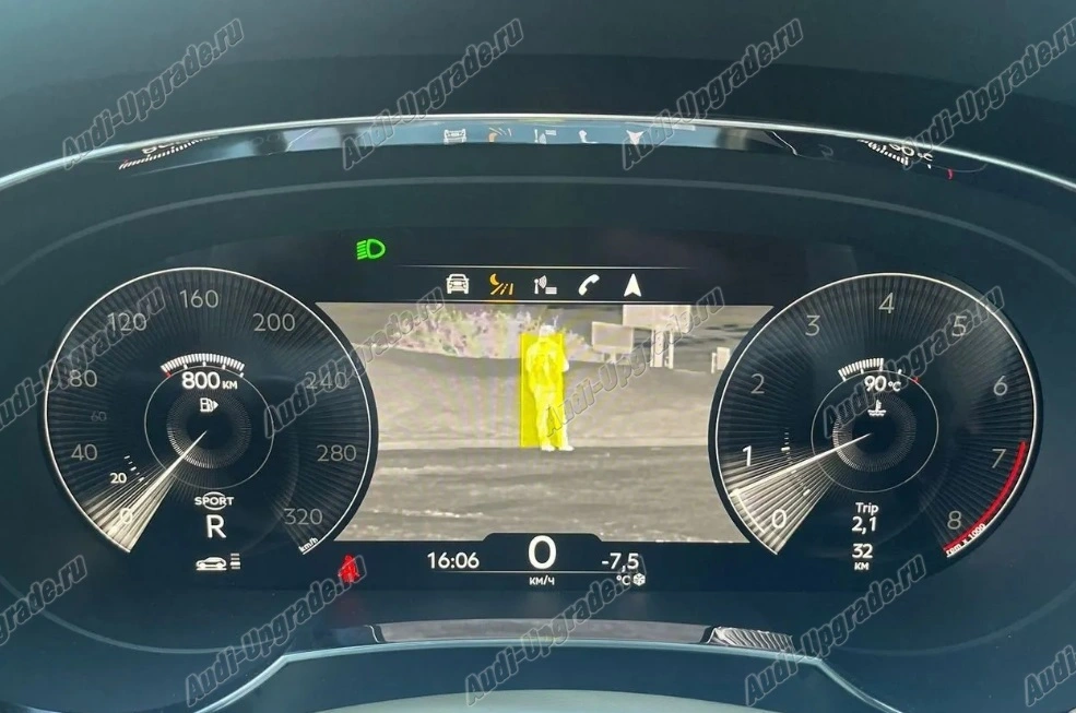 Инфракрасное тепловое изображение отображается на дисплее на приборной панели. Предоставляет водителю информацию, выходящую за пределы диапазона фар. Обнаруженные пешеходы, олени и другие крупные дикие животные выделяются желтым цветом. Пешеходы в критическом диапазоне выделены красным цветом, и водитель получает предупреждение (визуальное и звуковое).