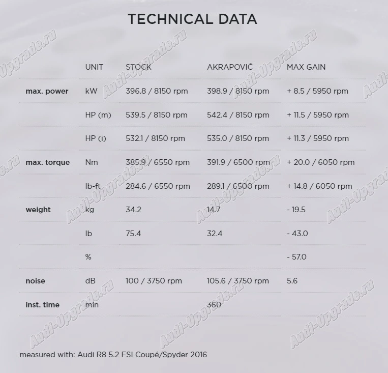 Точно спроектированный из высококачественного титанового сплава, который предназначен для значительного снижения веса и улучшения управляемости, Slip-OnLine имеет более крупные основные трубы, чем стандартная система, и специально разработанную X-образную часть (для поперечного потока) в глушителе. для уменьшения противодавления, увеличения мощности и крутящего момента во всем диапазоне оборотов. Уникальное рычание безнаддувного двигателя V10 улучшается по мере роста производительности, обеспечивая характерную ноту, которая волнует чувства, без какого-либо нежелательного шума в салоне. На низких оборотах и ​​в крейсерском режиме клапаны закрыты, из-за чего звук выхлопа становится более глубоким и резким, но когда обороты повышаются и клапаны открываются, раздается полный страстный саундтрек двигателя, чтобы показать, что AUDIR8 не шутит. Эта изысканная система идеально оснащена четырьмя выхлопными трубами из углеродного волокна (CARBON) , что гарантирует, что этот выхлоп выглядит так же хорошо, как и звучит.