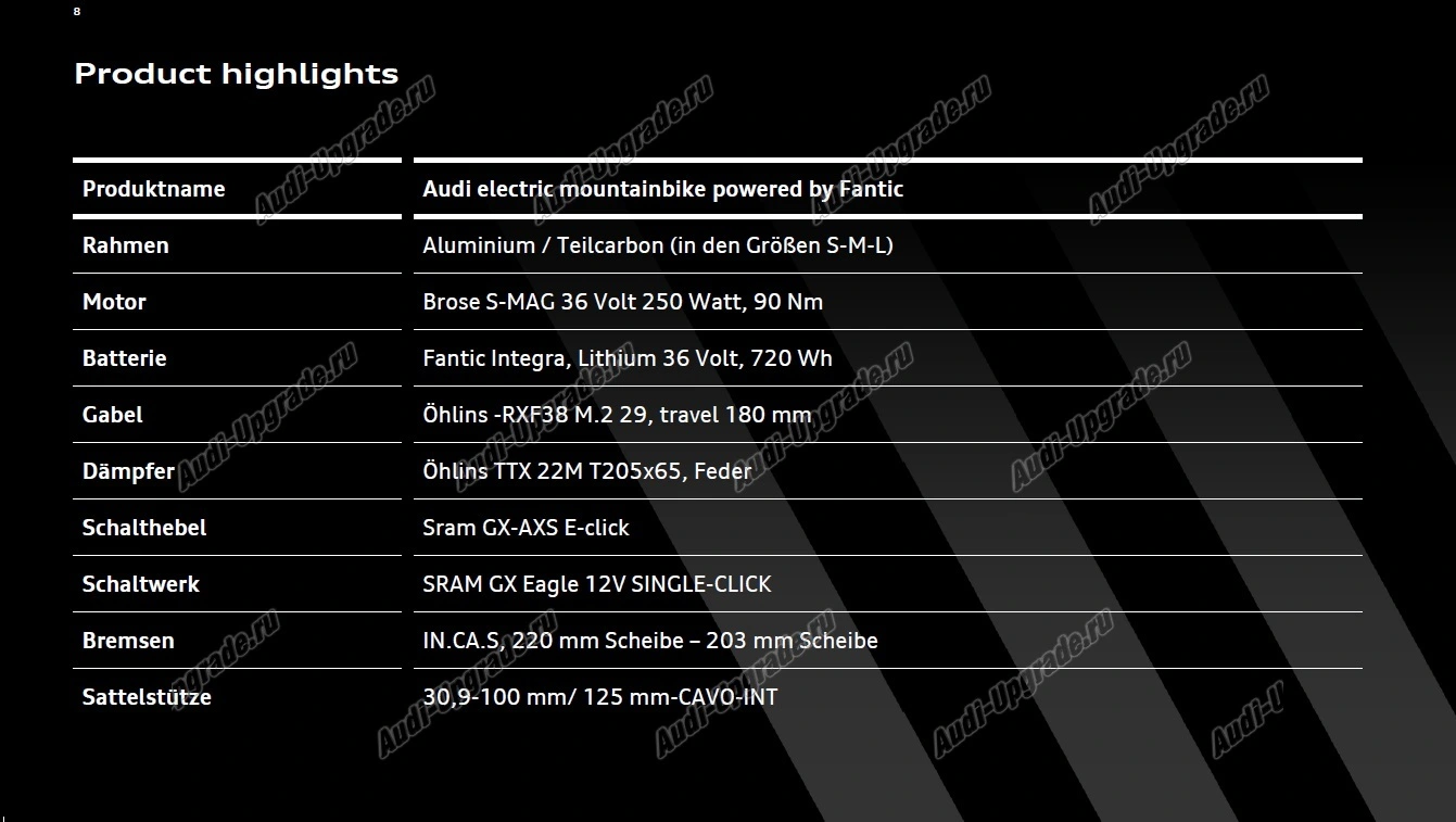 Разработан Audi и вдохновленн гоночным автомобилем AudiRSQE-tron ​​RallyParisDakar, электрический горный велосипед Audi с двигателем Fantic, отличный внешний вид с производительностью Audi.